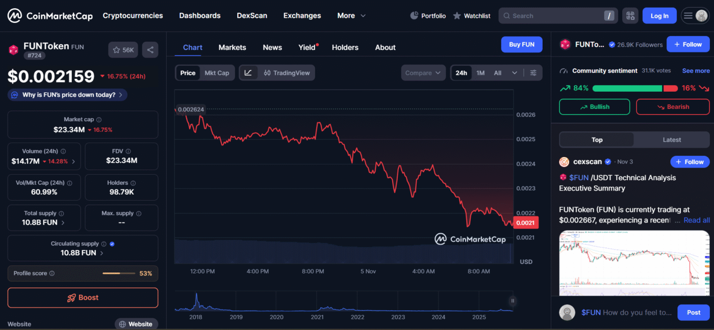 显示,当前FUNToken($FUN)价格约为0.002159美元,市值2333万美元,24小时交易量1419万美元,持有者数量接近98,790人。