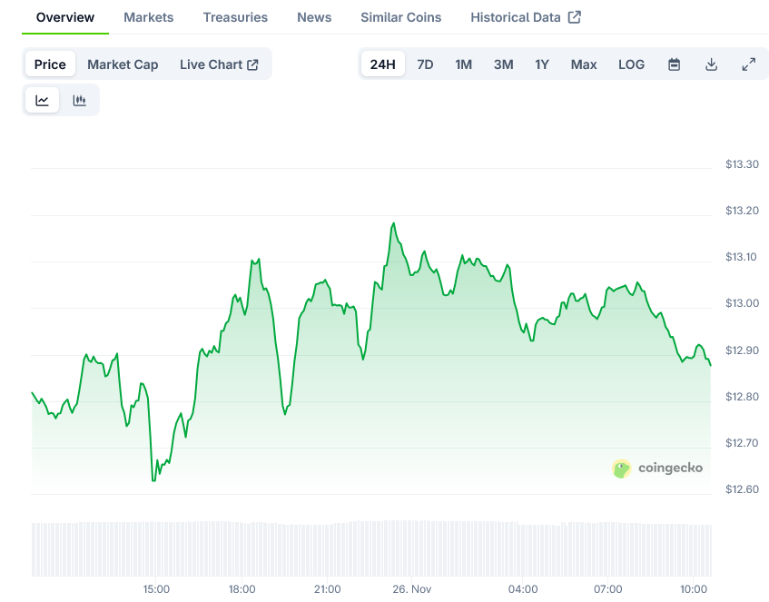 该代币维持在12美元支撑位上方。交易员正密切关注14美元阻力点。若价格突破该水平,分析师认为可能随后向15美元迈进。