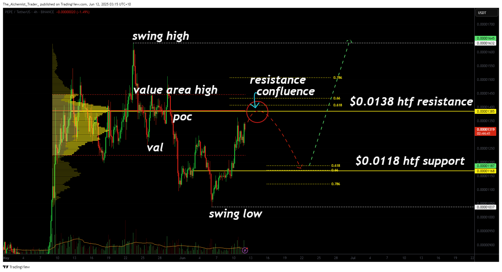 Pepe从清晰界定的摆动低点实现30%涨幅后,当前正测试包含以下要素的关键阻力集群:成交量分布中枢(POC)、大时间框架水平阻力位,以及前轮下跌的0.618斐波那契回撤位。该区域具有重要技术意义,通常与筹码派发或获利了结行为相关。