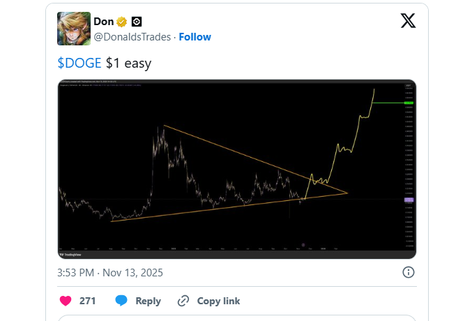 他预测未来几日DOGE价值或将跃升至0.18-0.19美元区间。交易员Tardigrade另发分析称,狗狗币已进入扩散楔形,价格可能先冲高至0.50美元,继而挑战0.79美元,成为当前购入的优选加密资产。