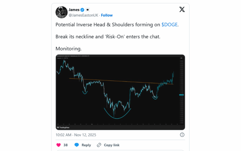 短期来看,Web3营销专家Aman认为狗狗币可能反弹至0.21美元。James指出其价格图表正在形成头肩底形态。