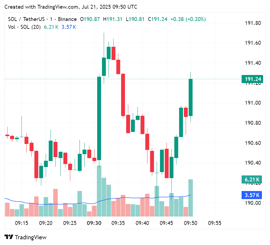推动市值上涨的核心因素是SOL代币近期的强势表现:过去两周累计上涨25.7%,近一个月涨幅达34.8%,24小时内再涨6.7%。当前191.29美元的成交价,是自今年2月初以来首次重返190美元上方。