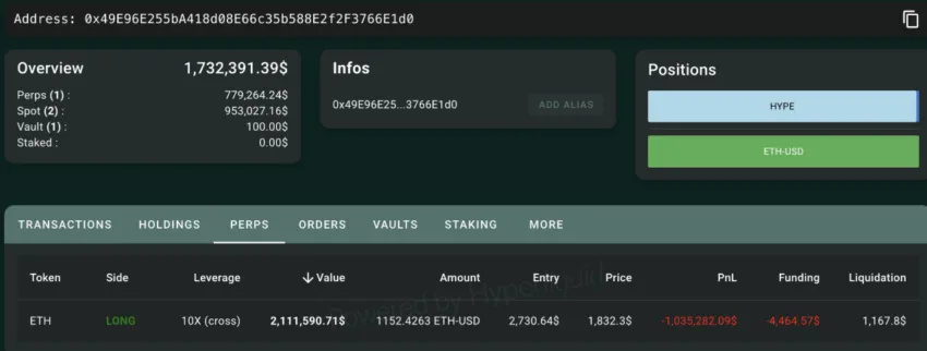 风险不仅限于PEPE。另一位知名交易者CBB在X平台上开设了价值211万美元的10倍杠杆多头头寸,目前正面临103.5万美元的未实现亏损,其开仓价格为2730美元。鉴于当前市场状况,这一价格已被证明过高。然而,与PEPE巨鲸不同,这位交易者的保证金缓冲更为充足,平仓价格为1167.8美元。