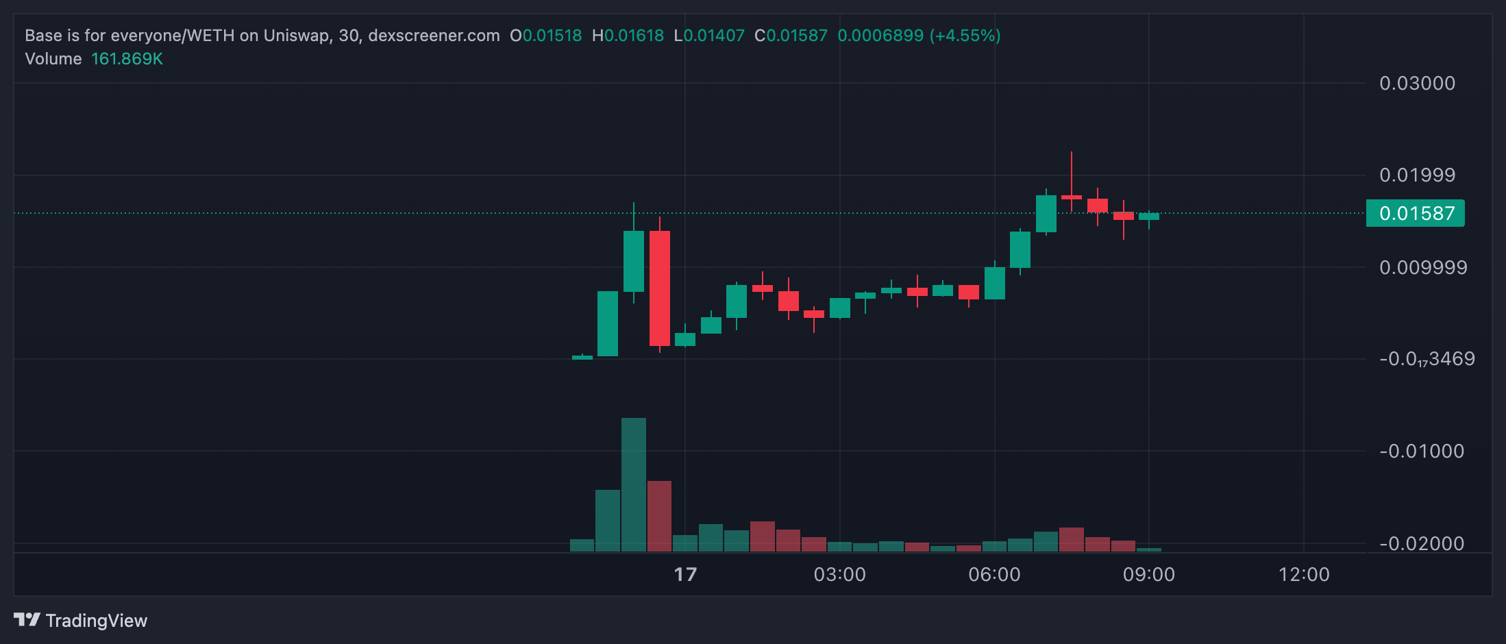 周三,Base在去中心化社交网络Zora上发布了一篇题为"Base is for everyone"的帖子。由于该平台上的每个帖子都会自动代币化,该内容被转化为一种代币。当天晚些时候,Base的官方X账户分享了该帖子的视觉内容,并链接到代币页面。