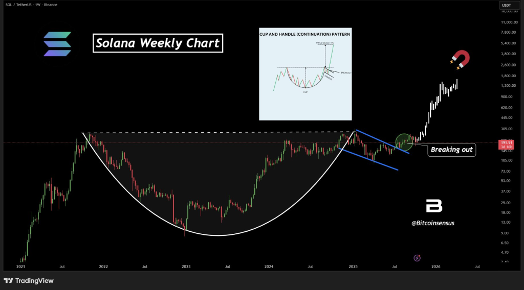 据BitcoinSensus分析,Solana已突破柄部结构,这是潜在上升趋势的关键信号。他指出191美元附近的阻力位对判断价格能否继续上行至关重要。若涨势持续,预测价格目标约为1300美元。