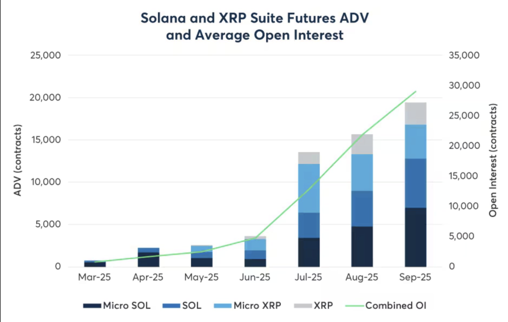 未平仓合约在9月突破21亿美元,使Solana成为CME史上最快实现未平仓合约从10亿美元翻倍增长的期货产品。期货交易的暴涨凸显了市场对Solana作为投资工具的需求增长。事实证明,Solana已成为CME最受欢迎的产品之一,其期货合约保持稳定增长。