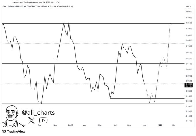 分析师@ali_charts认为该区域可能形成双底形态,为更大规模复苏奠定基础。从周期规律来看,每次触底后往往伴随快速反弹,因此ENA可能正处在转折点边缘。若价格在此区间企稳,持续的买盘压力或推动其测试0.45美元的首个阻力位。