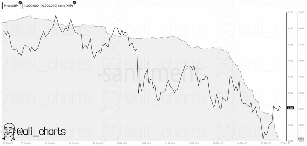 值得注意的是,11月26日的流入金额超过了同日比特币和Solana ETF的资金流。当日比特币ETF流入2110万美元,而Solana ETF则首次录得820万美元流出。这表明机构持续看好该资产,一定程度上抵消了瑞波鲸鱼的大规模抛压。