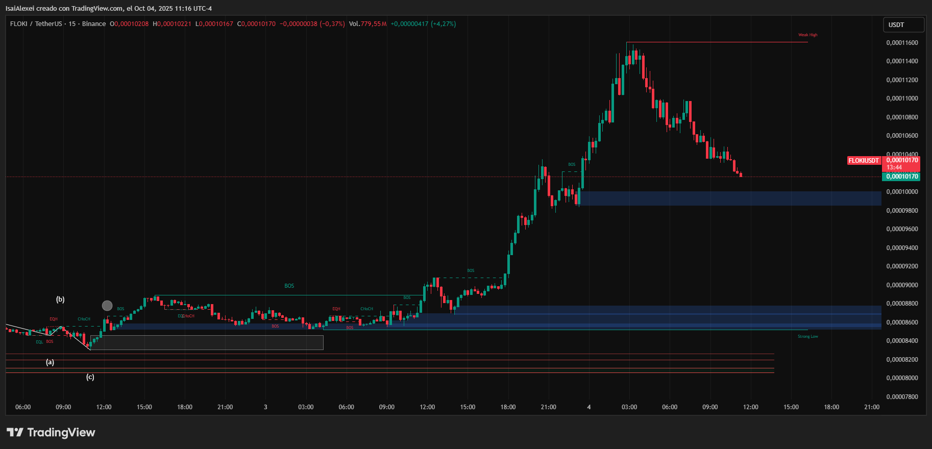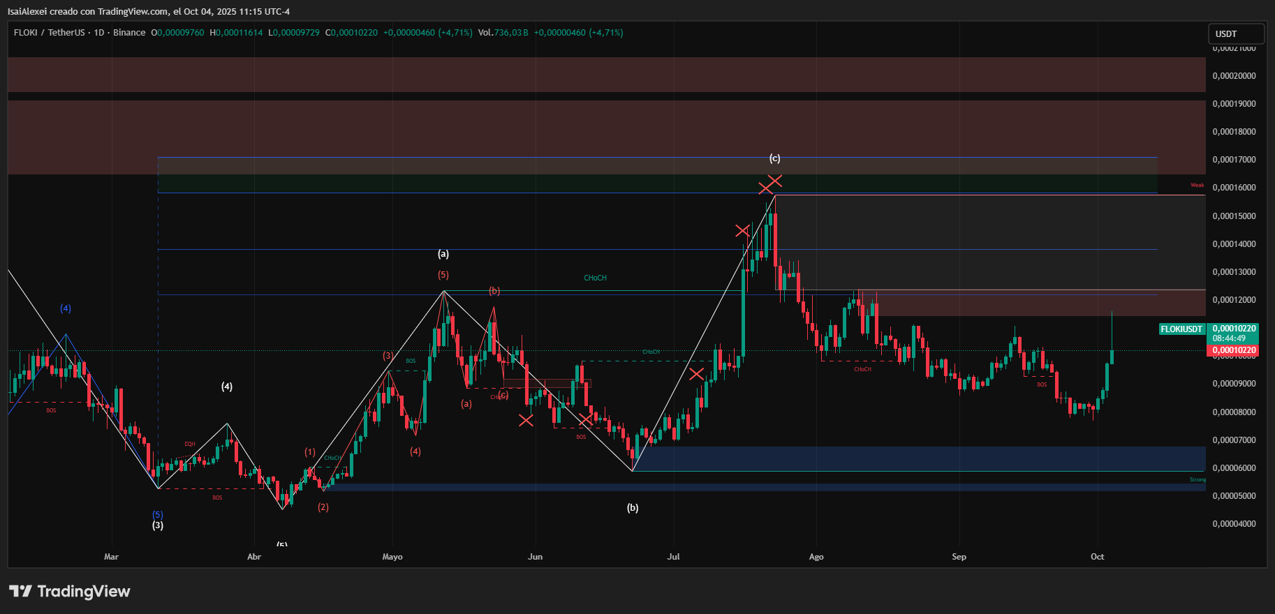 从技术面看,FLOKI近期突破$0.0001000支撑位,该位置目前转化为上行基础。阻力区位于$0.0001100-$0.0001200区间,支撑位在$0.0000950-$0.0001000。若看涨动能持续,代币可能试探$0.0001250-$0.0001300区域。