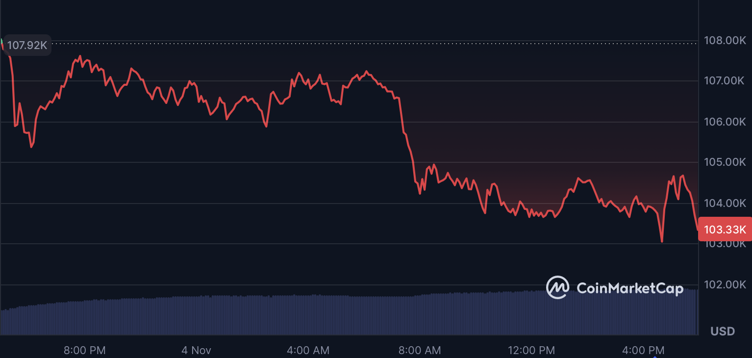 比特币(BTC)价格跌破10.4万美元,分析师警告称在宏观经济和去中心化金融(DeFi)问题加剧的背景下,可能进一步下探10万美元关口。预测市场目前认为比特币11月跌破10万美元的概率高达74%,这将成为长期支撑位的关键考验。