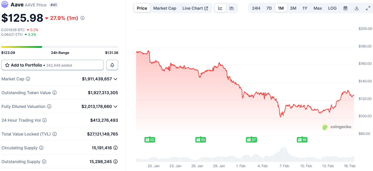 尽管市场地位稳固,Aave原生代币仍未能抵御近期加密货币市场的整体下行趋势。最新数据显示,该代币在过去24小时内再度下跌1.6%,2026年以来累计跌幅已达15.2%,目前报价125.98美元,较2021年5月的历史高点下跌81%。