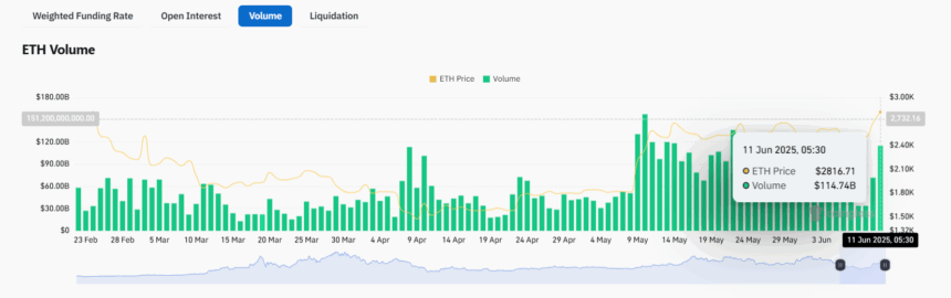 在鼎盛时期,以太坊不断创造头条新闻——它以1140亿美元的24小时衍生品交易量在另一项关键指标上超越了比特币(6月11日比特币交易量为800亿美元)。这一转变发生时,现货以太坊ETF资金流入量近期已超过比特币(主要得益于机构资金涌入),同时ETH价格持续突破阻力位,自5月7日启动的涨势中已飙升逾54%。