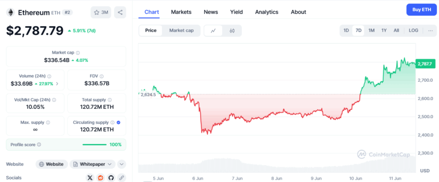 截至撰稿时,ETH交易价格接近2,787美元——24小时内上涨5.91%。其日交易量增长28%,目前达到336.9亿美元。