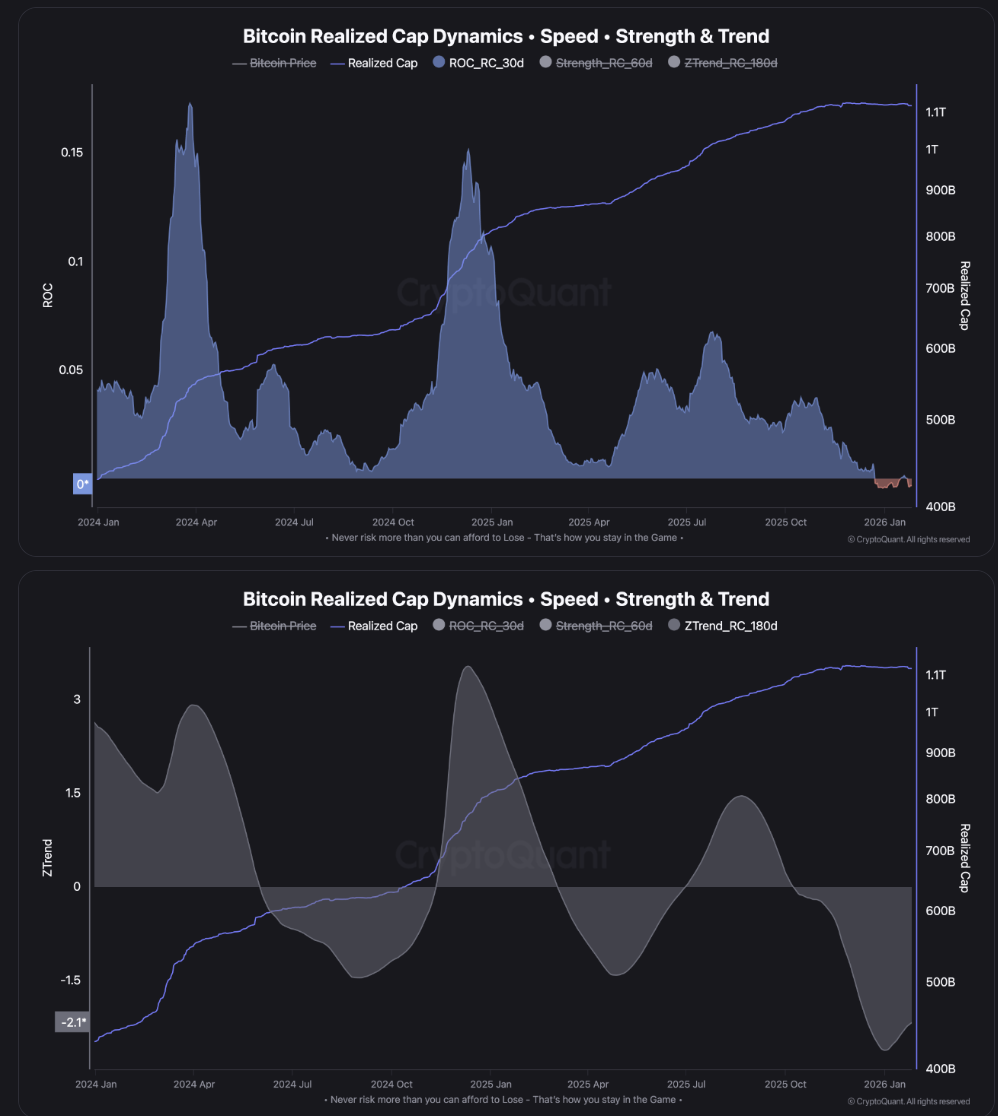 虽然比特币的已实现市值表明资金并未流出系统,但其变化率已转为负值。已实现市值Z趋势线同样在下降,这种模式通常与周期末期行为或长期的区间震荡交易相关联。