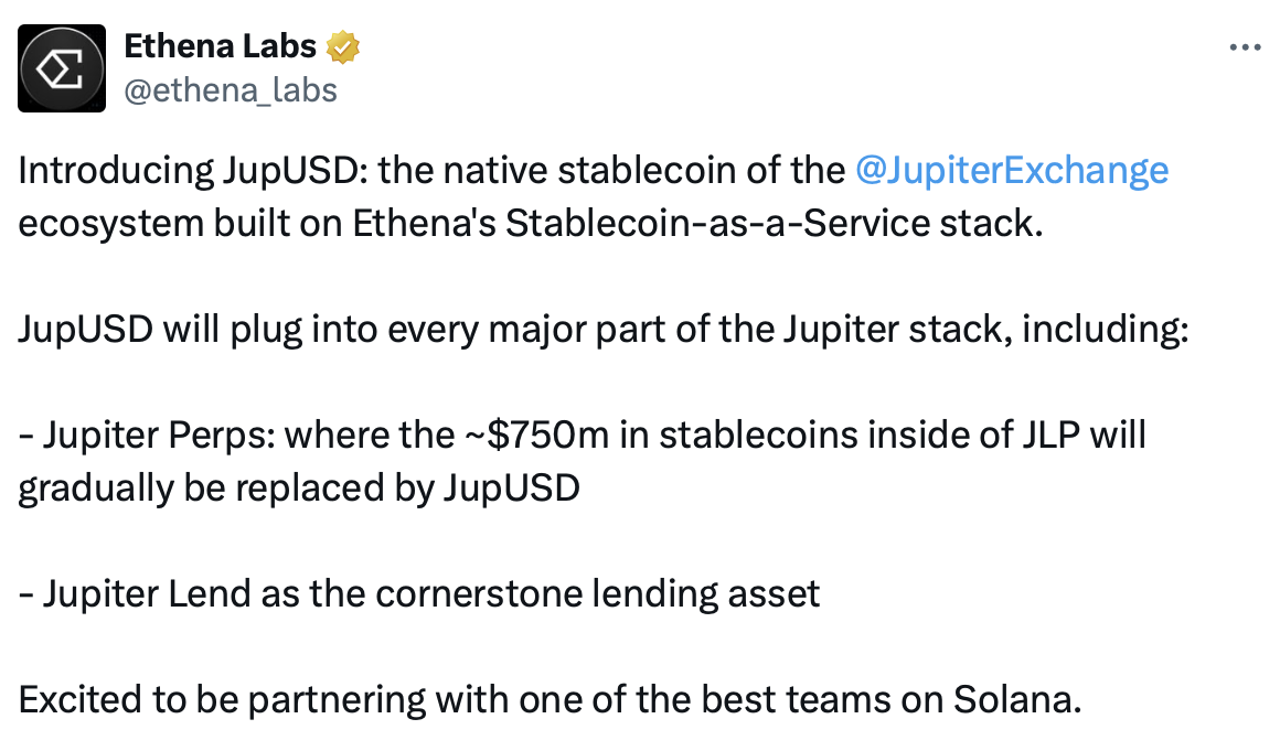 去中心化金融领域持续创新,多款稳定币项目即将面世。Solana生态领先的去中心化交易平台Jupiter宣布与EthenaLabs合作,计划于2025年第四季度中期推出其原生稳定币JupUSD。这一进展标志着白标稳定币正日益受到加密生态系统的青睐,市场对合规、可扩展的法币锚定数字资产需求激增。