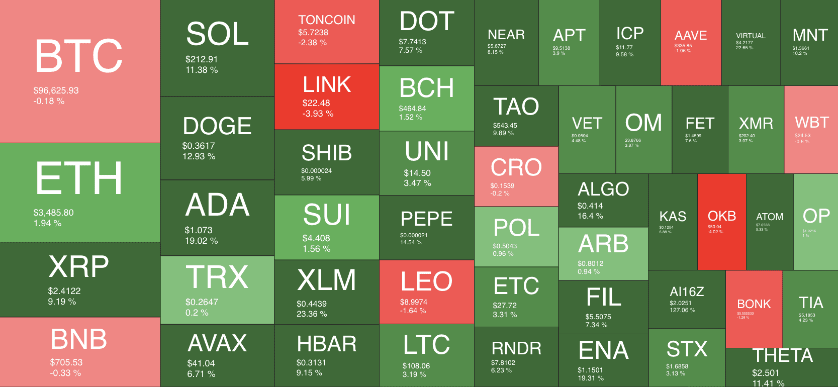 表现突出的币种包括:Ripple的XRP上涨11%,Solana(SOL)上涨13%,DOGE上涨14%,ADA更是飙升21%。总体而言,顶级山寨币本周表现优异。