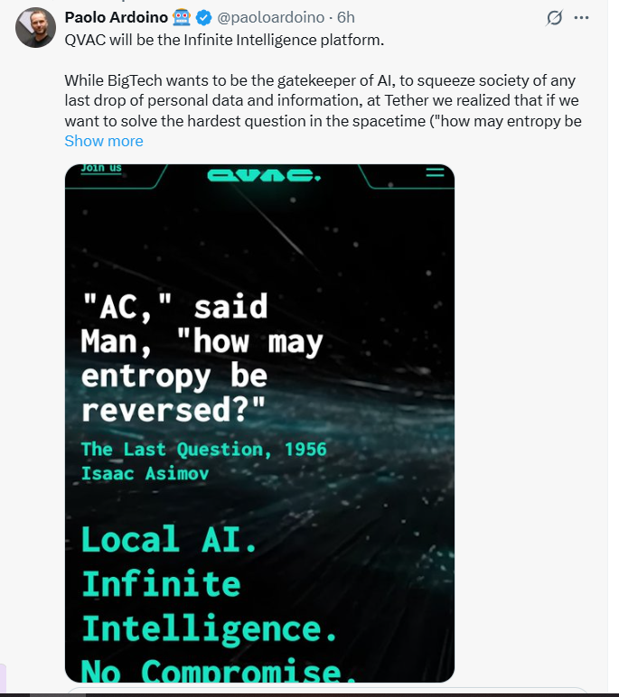 QVAC平台,即QuantumVerse自动计算机,旨在帮助开发者构建AI系统。据公司介绍,这些系统可以完全在用户设备上运行,如手机、电脑和脑机接口。这意味着用户无需云连接或中央服务器,从而使系统更快、更私密,且更难被关闭。