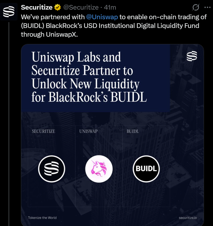 根据周三的公告,贝莱德的美元机构数字流动性基金(BUIDL)将在Uniswap去中心化交易所上市,允许机构投资者买卖该代币化证券。公告同时指出,作为合作安排的一部分,贝莱德还将购入未披露具体数量的Uniswap原生治理代币UNI。
