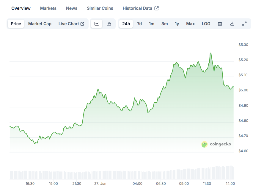 CoinGecko数据显示,APT现报5.03美元,日内涨幅5.18%,周涨幅超13%。从4.25美元区域的反弹凸显了技术需求区的买家兴趣。
