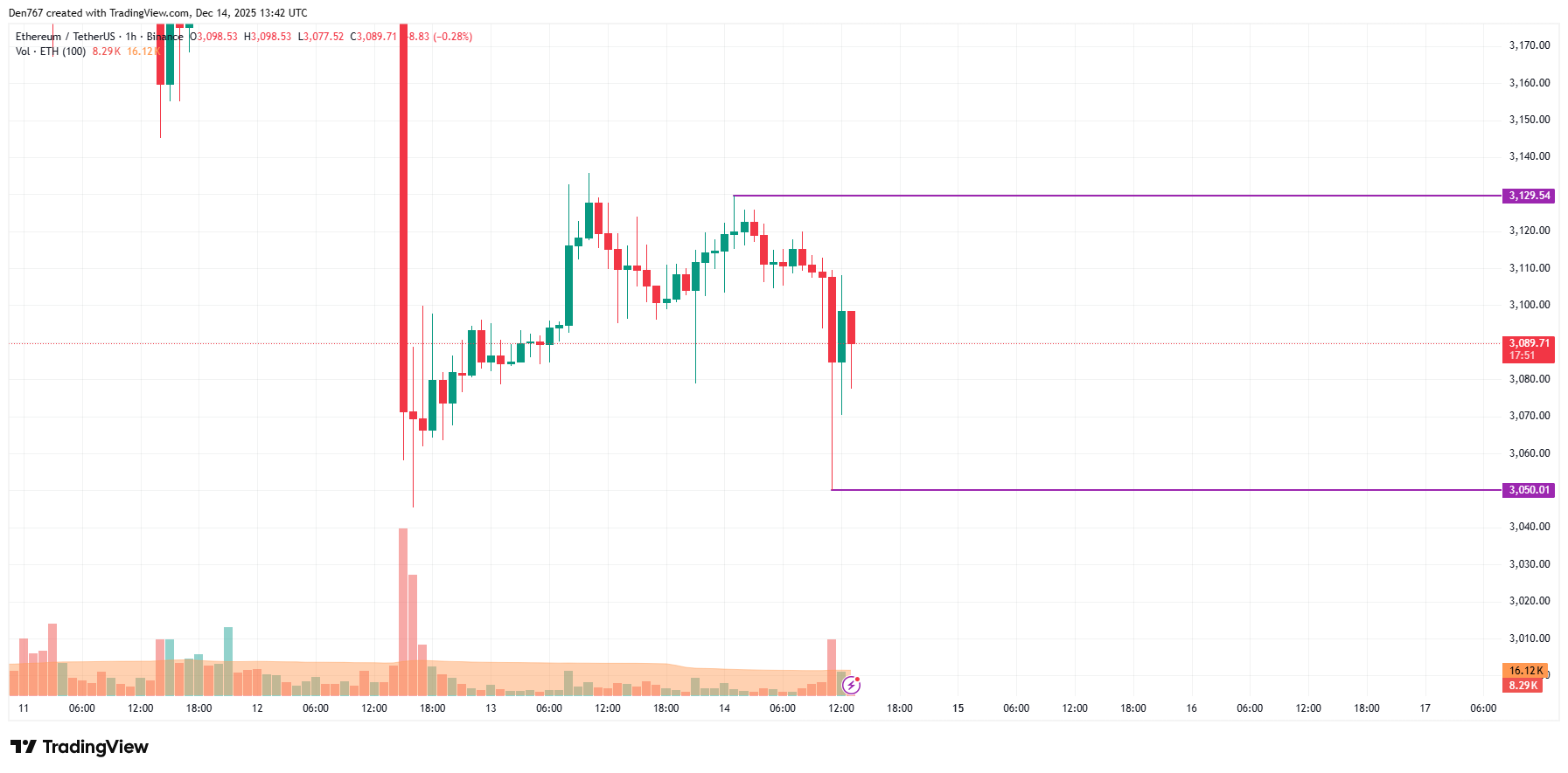 从小时线观察,ETH价格正处于3,050美元支撑位与3,129美元阻力位构成的局部通道中段。由于多空双方均未占据主导优势,预计截至明日出现剧烈波动的可能性较低。