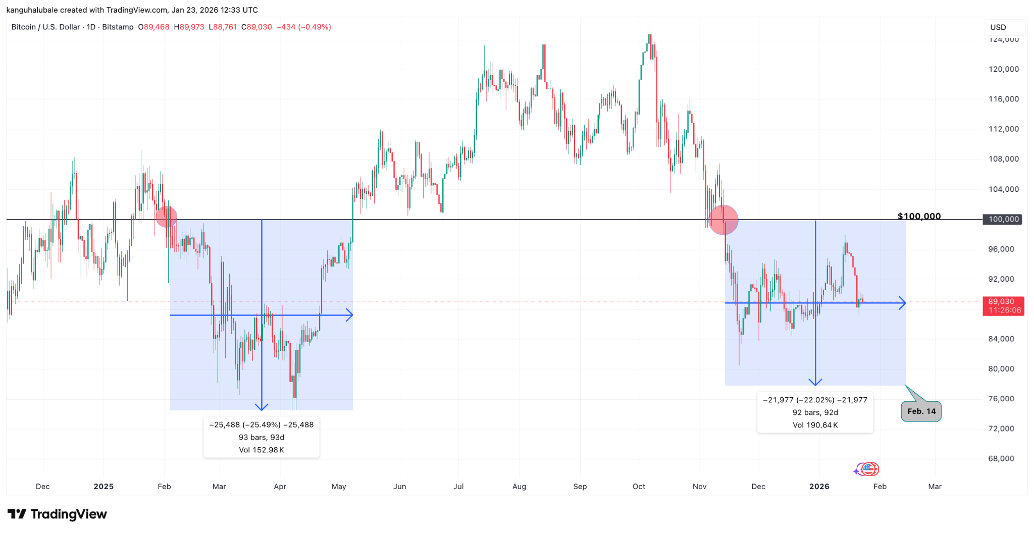 比特币在2026年的最高价为1月14日触及的97,900美元,而上一次BTC/USD交易对站上10万美元要追溯到去年11月13日。历史数据显示,当BTC/USD上次跌破10万美元后,经历了93天的调整与25.5%的跌幅才重新收复该关口。