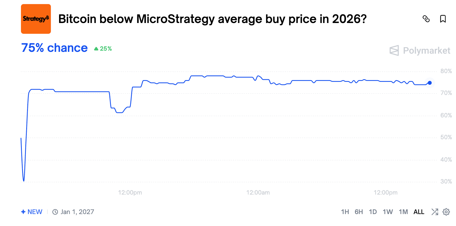 越来越多迹象表明比特币已进入熊市周期,下行目标可能低至5.8万美元。Polymarket交易者认为比特币在2026年跌破Strategy公司平均持仓成本价(截至发稿时为75,979美元)的概率高达75%。