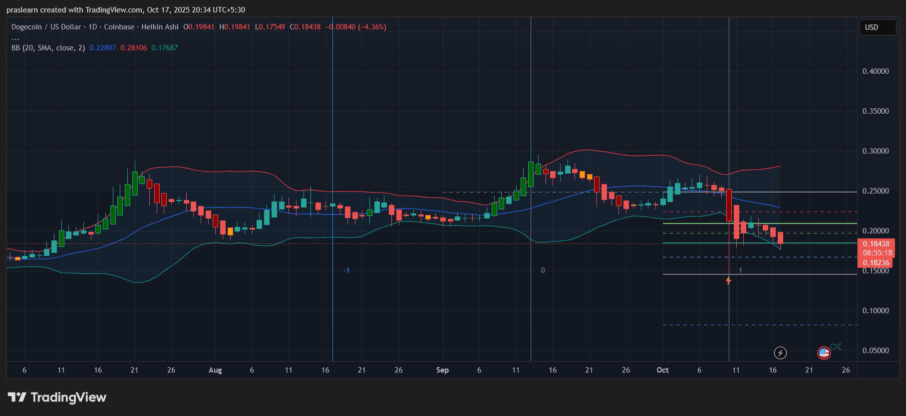 日线图上,狗狗币(DOGE/USD)正呈现教科书般的疲态。平均K线显示出一连串无下影线的长实体阴烛,表明看跌动能持续强化。虽然布林带通道扩张暗示波动加剧,但价格已滑落至0.176附近的低位区间。0.228附近的中轨线现已转化为强阻力位。