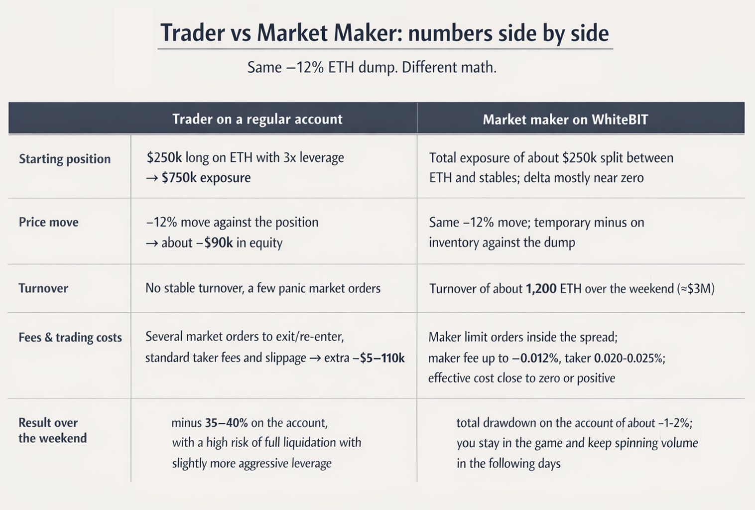 下图展示同等ETH暴跌12%时,普通交易者与WhiteBIT做市商的差异对比: