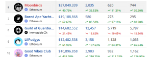 无聊猿游艇俱乐部(1900万美元,+62%)、GoG Heroes(1400万美元,-21%)、Lil Pudgys(1200万美元,+61%)和Good Vibes Club(1000万美元,+418%)分列七至十名。