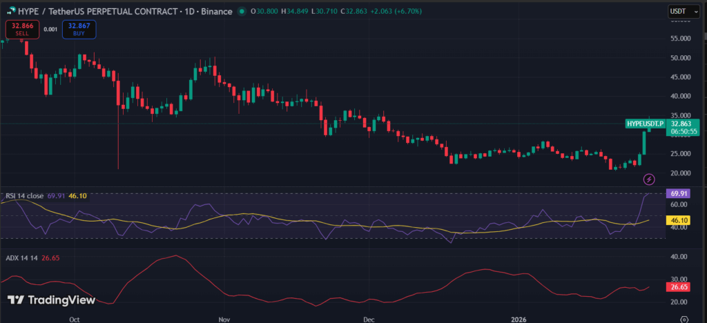 从日线图观察,HYPE在30美元下方经历长期横盘后出现明显突破。此前价格在20美元中段附近持续数周受阻,近期突破该区间与前期低点反弹形成共振。