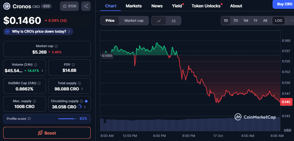 Cronos(CRO)24小时内下跌6.59%,现报0.1460美元。此次下跌反映出主要交易所的短期抛售动能,但交易活动仍保持活跃,表明市场在回调中持续参与。