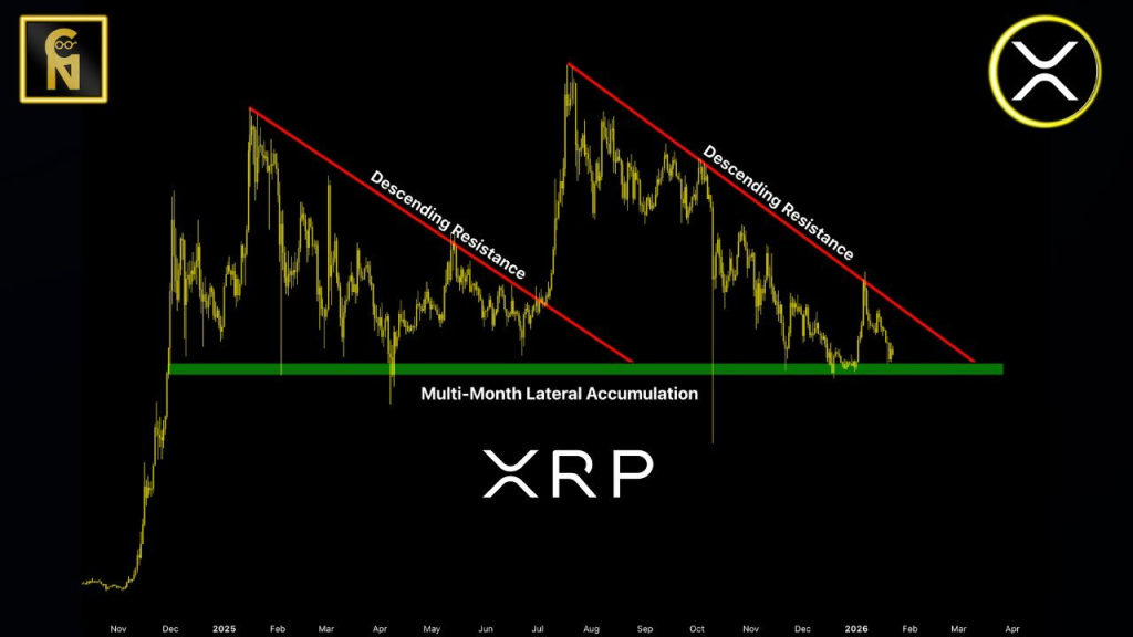 Chart Nerd坚持认为解决方案始终明确:XRP价格需要收于2.1美元附近的下降趋势线上方。在此条件达成前,只要长达数月的吸筹支撑保持完好,价格走势将继续维持区间震荡格局。