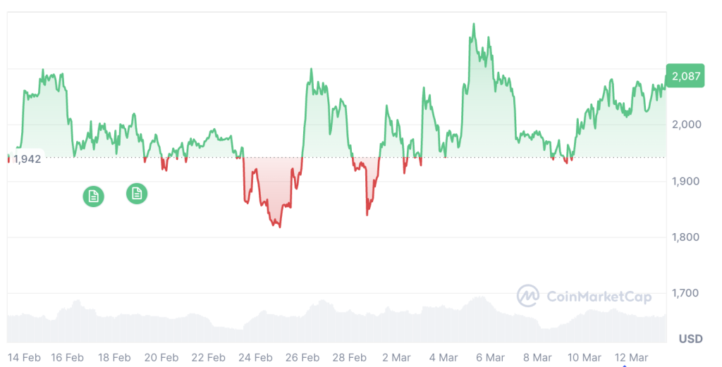 截至发稿时,根据CoinMarketCap数据,以太坊交易价格为2,087美元,过去30天内下跌2.98%。