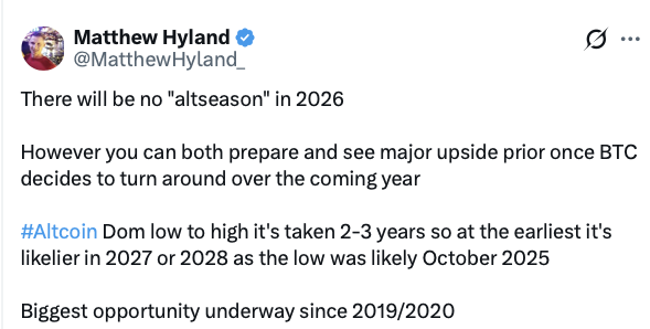 山寨币季讨论的减少表明,整个加密货币市场的风险偏好仍然低迷,交易员仍然偏爱比特币而非投机性更强的代币。