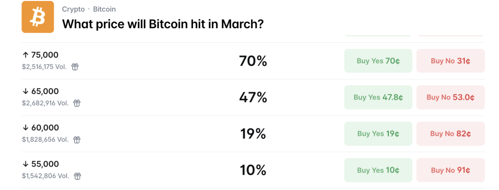 预测市场参与者倾向于比特币本月收盘价将高于当前价格,但其跌回60,000美元附近的可能性仍然相对较高。在Polymarket上,比特币在3月收盘于75,000美元上方的概率为70%,而下一个最有可能的结果(47%)是在月底前跌破65,000美元。