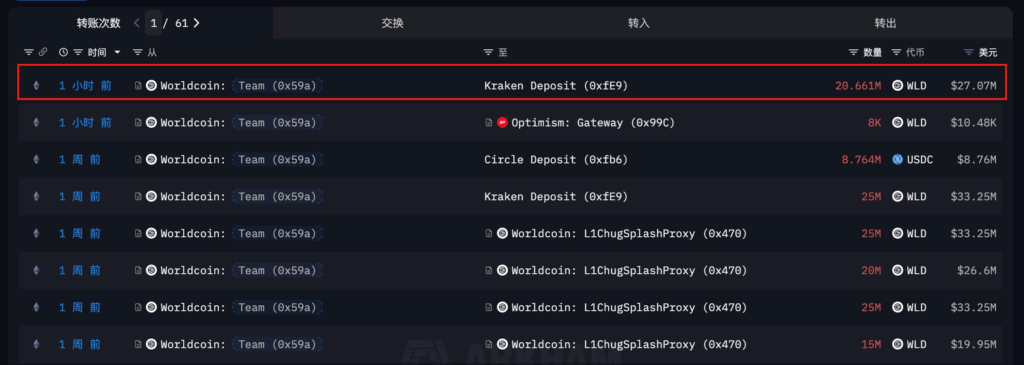 Worldcoin钱包向Kraken交易所转移了价值2707万美元的2066万枚WLD代币。