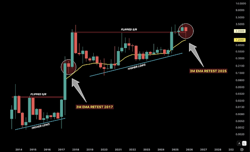XRP整体结构反映出与2017年上涨期相似的长周期模式。ChartNerdTA指出,XRP在强势突破后曾回落至三个月20日指数移动平均线,随后快速上涨。当前向同一均线回撤的三个月调整期呈现出相同的技术形态。