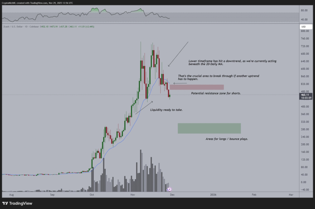 Zcash已进入短期下跌趋势,跌破20日移动平均线表明看涨动能减弱。交易员正密切关注两个关键价格区域,这些区域可能决定该代币的后续走势。