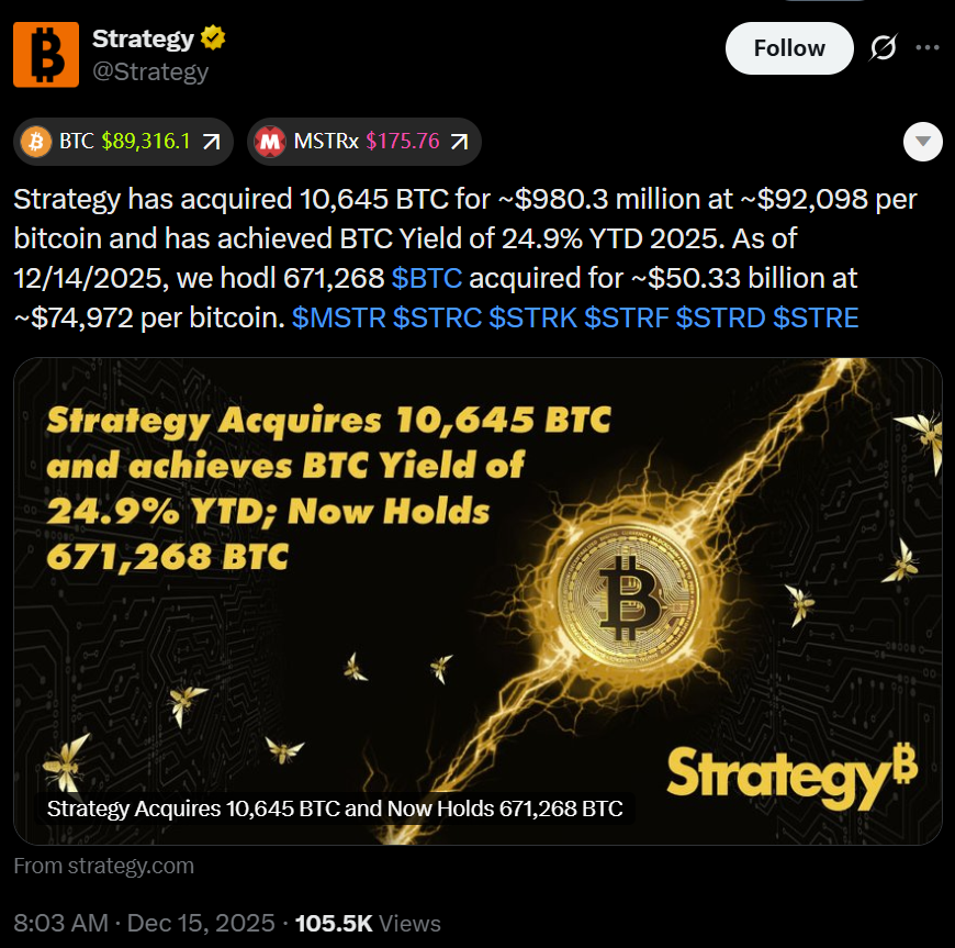 尽管市场波动剧烈,企业买入步伐仍未停歇。Strategy周一披露,仅上周就增持超1万枚BTC,使其两周累计增持量突破2万枚。