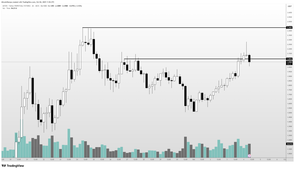 ASTER代币价格正再度升温,交易者们密切关注其能否突破阻力位或重新进入盘整阶段。该代币目前徘徊在2.01美元附近,分析师对后续走势存在分歧。知名分析师Altcoin Sherpa在推文中阐述了他继续持有该代币的理由,同时也指出当前操作存在风险。