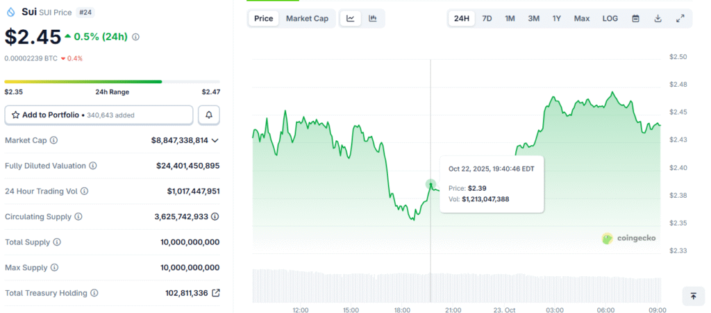 据CoinGecko数据,SUI现报2.45美元,24小时微涨0.5%。当前交易区间支撑位2.35美元,阻力位2.47美元。