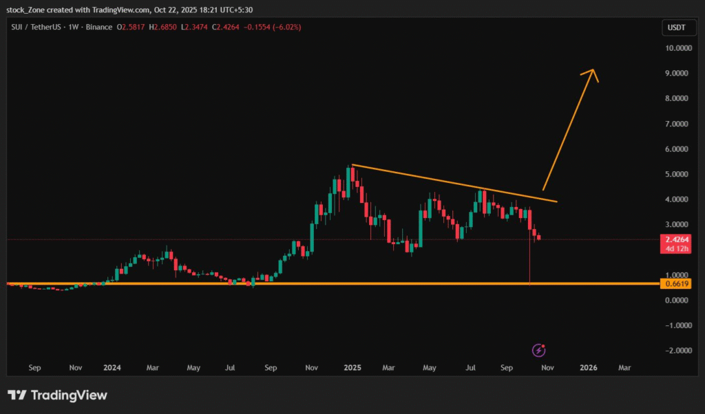 分析师Suinter分享的月线图显示,SUI长期下降趋势线下方0.66美元附近形成关键支撑区。价格多次从该区域反弹,构筑看涨基底。