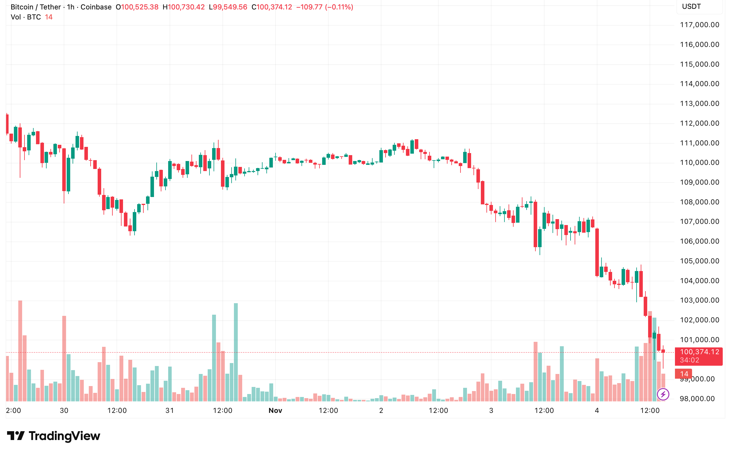 2025年11月4日尾盘交易中,比特币正式跌破10万美元心理关口,最低触及99,750美元附近。24小时内跌幅超过6.4%,创下数月来最剧烈的单日调整,市场同时出现大规模清算和宏观经济不确定性加剧。