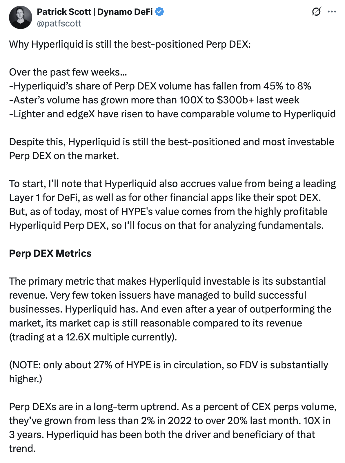 在近期一份分析报告中,帕特里克·斯科特(Patrick Scott)指出,尽管市场份额有所下滑,Hyperliquid仍在永续合约交易领域保持着最佳竞争态势。去中心化交易所(DEX)的永续合约市场份额从2022年不足2%急剧攀升至今年9月的20%以上。在此期间,Hyperliquid的交易量占比从45%降至8%,而与币安关联的Aster平台周交易量则突破2700亿美元。斯科特的研究不仅聚焦Hyperliquid平台,还深入分析了其生态代币HYPE。
