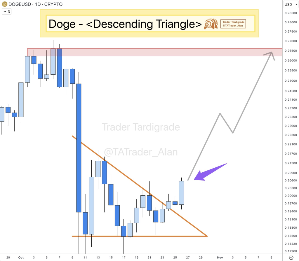 狗狗币(DOGE)在日线图上突破下降三角形形态后价格飙升。技术分析显示,突破后可能触及前摆动高点0.265美元。该上涨趋势得到有力佐证——一根强势阳线收于三角形阻力线上方。