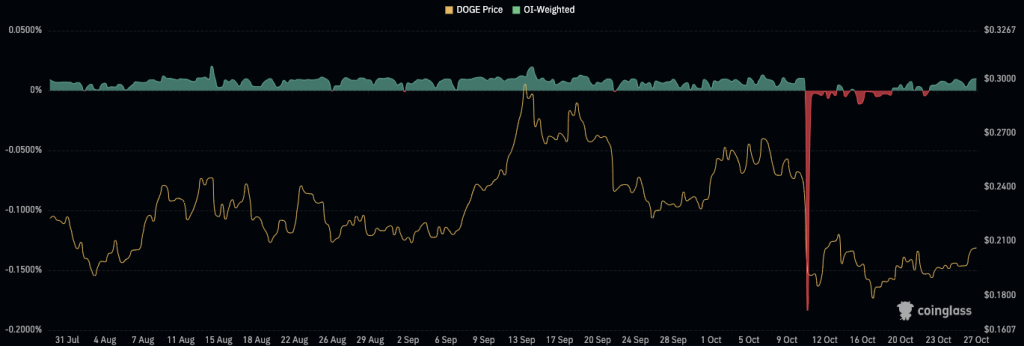 尽管技术面乐观,DOGE在十月中旬仍经历急速下跌,价格从0.27美元跌穿0.18美元。同期持仓加权资金费率骤降,反映市场情绪转变及多头大规模平仓。