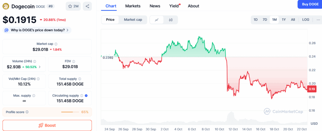 随着投资者在牛市初期寻求高收益标的,狗狗币和柴犬币重新获得关注。当前DOGE交易价约0.1915美元,支撑位0.14/0.11/0.09美元,阻力位0.25/0.33/0.45美元。