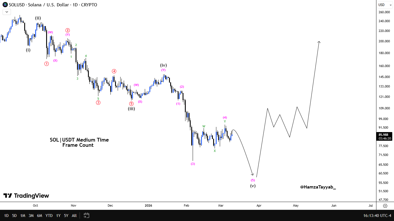 与此同时,分析师预测SOL价格目标为200美元。在价格预测中指出,SOL价值可能跌至55美元以完成第五浪调整,随后有望反弹至200美元。