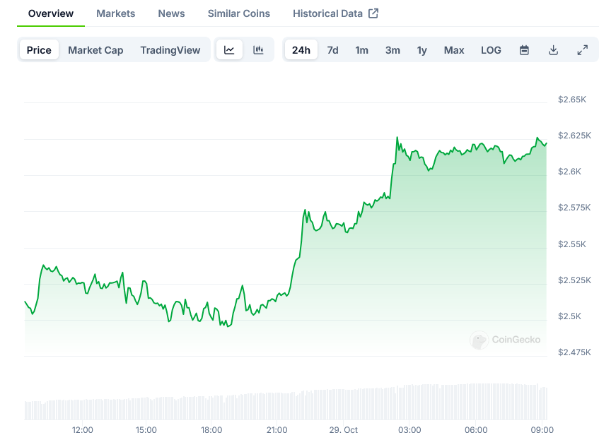 市场数据显示,在公告发布后,交易活动显著增加。价格波动使以太坊突破2,600美元大关,一些市场参与者将3,000美元视为潜在的下一个目标,这标志着近期市场情绪出现了显著转变。