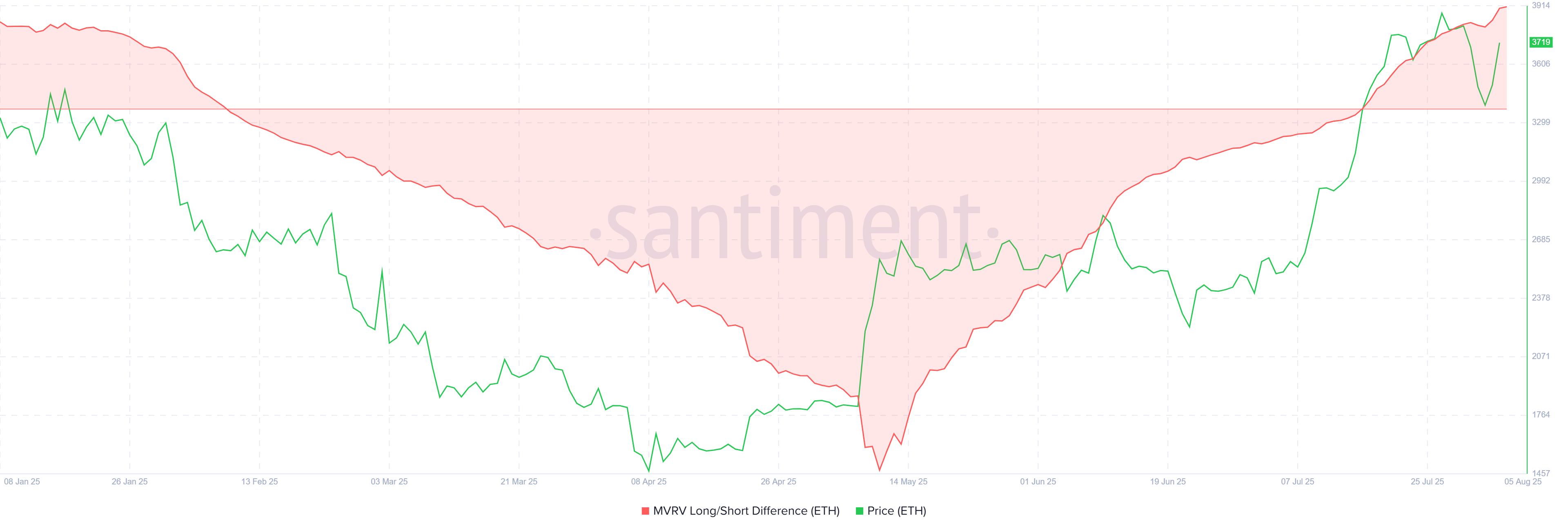 尽管ETF资金外流严重,链上数据显示积极信号。衡量长短期持有者盈利能力的MVRV多空差值当前处于七个月高位,表明长期持有者(LTH)主导着以太坊市场。这类持有者通常抛售倾向较低且对价格影响力较大,有效抵消了ETF资金外流的负面影响。